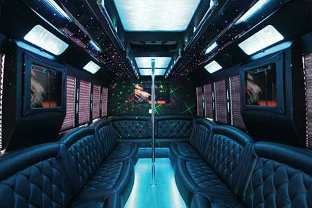 As many as thirty passengers can be accommodated by our large party buses. These vehicles offer amenities like wraparound seating, dance poles, flat screen televisions, even light shows and mirrored ceilings. Ice and mixes are available at fully furnished bars and state of the art sound systems encircle passengers with the music of their choice.